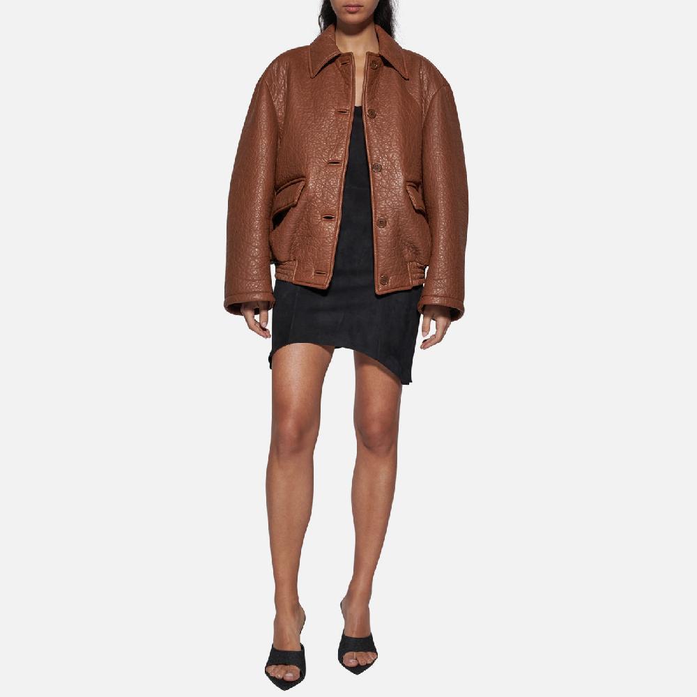 Questa giacca in pelle tobacco, con la sua texture ricca e imbottitura leggera, offre uno stile robusto e contemporaneo. Il taglio è corto e le tasche frontali con patta conferiscono praticità al design. Il colletto classico e la chiusura frontale a bottoni donano un tocco senza tempo, perfetto per le giornate più fredde. Questa giacca si distingue per il suo look grintoso e versatile, perfetto per un abbigliamento casual ma ricercato.